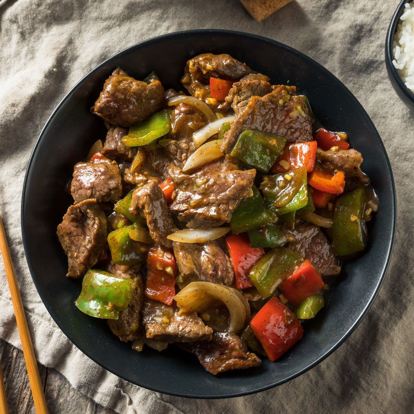 Ingredients: Beef flank steak, hoisin sauce, vinegar, soy sauce, hot sauce, sesame oil, ginger, garlic, brown sugar, salt, black pepper, onion, bell pepper, sesame seeds