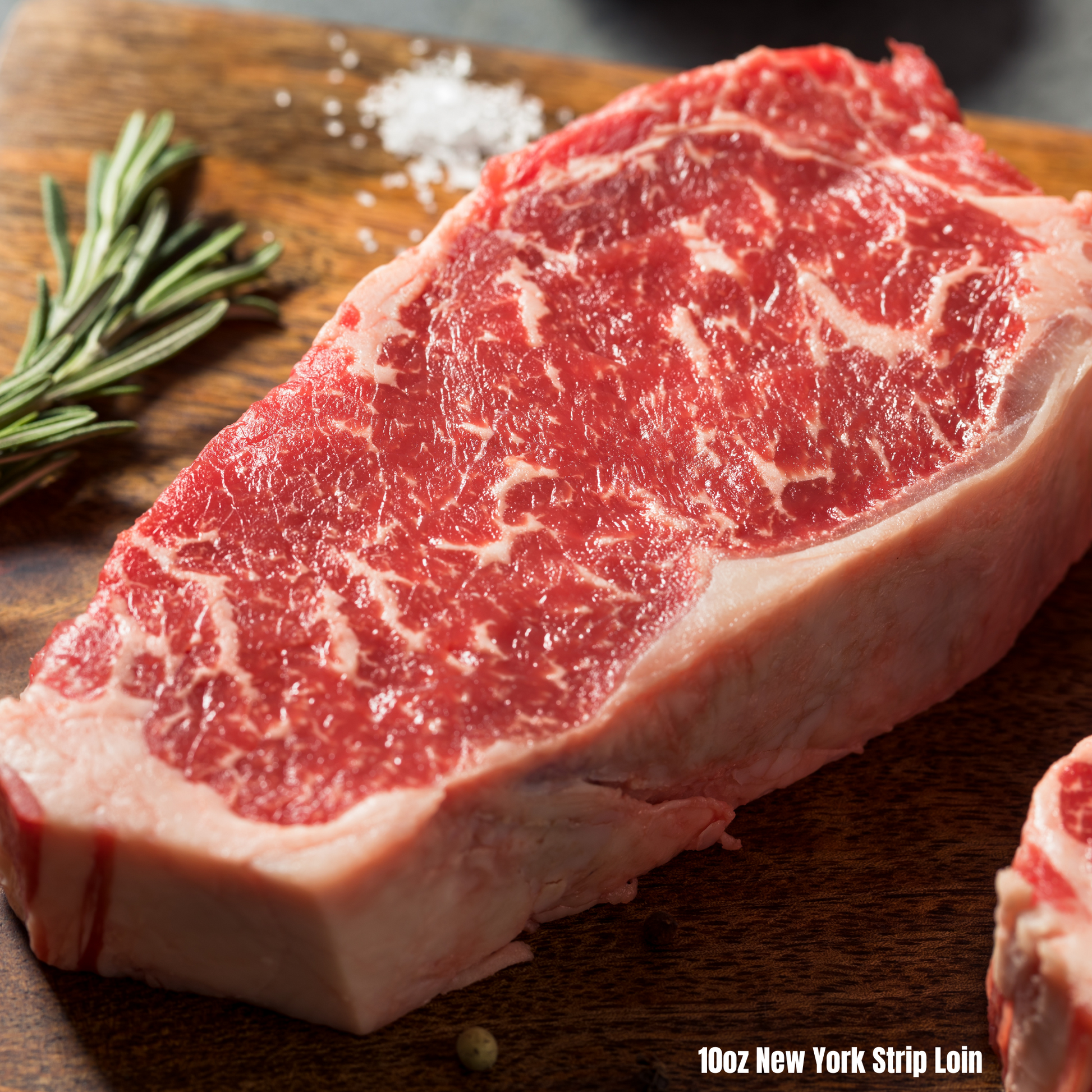 - Saturday: 1lbs ground beef, 10oz New York Strip Loin Steak