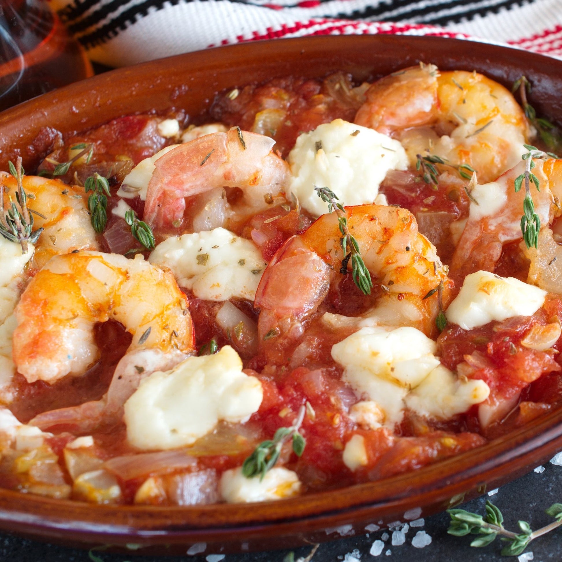 Ingredients: Tiger shrimp, feta cheese, rosemary, tomato, water, garlic, salt, butter, chilli flakes, oregano